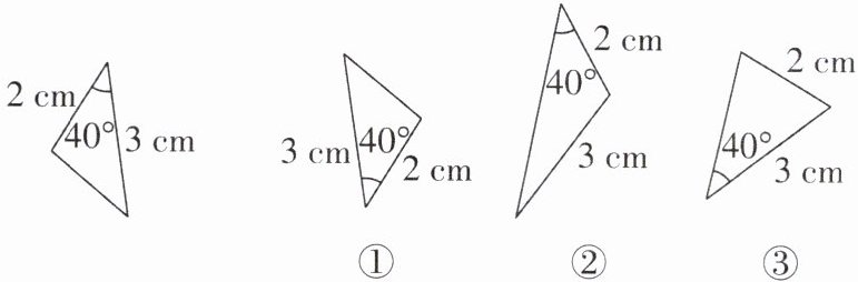 1. D 【解析】由题图可得已知两边及其40°的夹角,只有①与题图满足两边及其夹角分别相等,