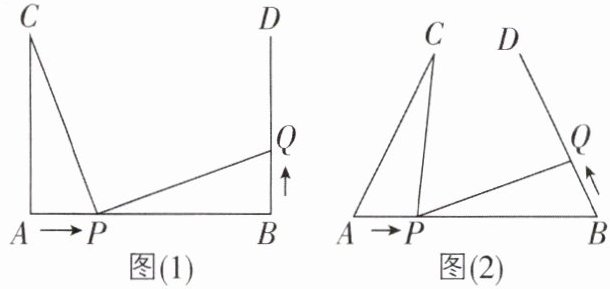 (2)如图(2),若“$AC\perp AB$,$BD\perp AB$”改为“$∠CAB = ∠DBA$”,点$Q$的运动速度为$x\ cm/s$,其他条件不变,当点$P$,$Q$运动到某处时,有$\triangle ACP$与$\triangle BPQ$全等,求出相应的$x$,$t$的值.