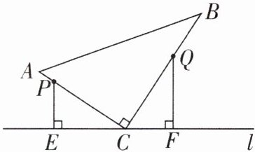 12 [2025吉林长春榆树期中,中]如图,在$△ABC$中,$∠ACB = 90^{\circ },AC = 6,BC = 8$,点C在直线l上. 点P从点A出发,沿折线AC - CB以每秒1个单位长度的速度向终点B运动,点Q从点B出发沿折线BC - CA以每秒3个单位长度的速度向终点A运动,P,Q两点同时出发,分别过P,Q两点作$PE⊥l$于E,$QF⊥l$于F. 设点P的运动时间为t秒.