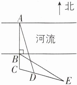 10 [2025山西长治期中,中]某中学几名同学想利用所学知识测量某段河流的宽度(宽度一定),测量方案:他们位于河的南岸,寻找对岸河边一棵树的位置记作点A,在南岸河边寻找点B,使AB垂直于河岸,在南岸平地上取点C,D,使A,B,C三点在同一直线上,且$CB = CD,∠BCD = 105^{\circ }$,测得$∠ADC = 55^{\circ }$,在CD的延长线上取一点E,使$∠BEC = 20^{\circ }$,示意图如图所示,这时测得DE的长就是该段河流的宽度. 你认为这几名同学的测量方案可行吗?请说明理由.
