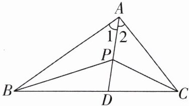 4 [2025 吉林长春期末,中]“截长补短法”是作辅助线的常用方法。截长法:在较长的线段上截取一条线段等于较短线段;补短法:延长较短线段使其和较长线段相等。这两种方法统称截长补短法。请用其中一种方法解决下列问题:如图,在△ABC 中,AB > AC,∠1 = ∠2,P 为 AD 上任一点,求证:AB - AC > PB - PC。