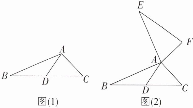 (2)如图(2),AD 是△ABC 的中线,AB = AE,AC = AF,∠BAE = ∠FAC = 90°,试探究线段 AD 与 EF 的数量关系和位置关系,并加以证明。