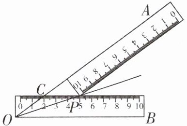 6 [2025辽宁大连期中]小明将两把完全相同的长方形直尺按如图所示方式放置在∠AOB上,两把直尺的接触点为P,边OA与其中一把直尺的一边重合,与另一把直尺的一边交于点C,点C,P在这把直尺上对应的刻度分别是2,5,则OC的长度是______。