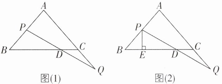 1 [2025山东菏泽调研,较难]如图,在$\triangle ABC$中,$AB= AC$,点P从点B出发沿线段BA移动,同时,点Q从点C出发沿线段AC的延长线移动,当点P移动至点A时,P,Q两点同时停止移动.已知点P,Q移动的速度相同,PQ与BC相交于点D.