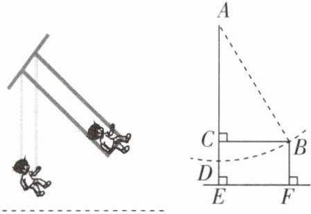 4 [2025江苏盐城期中,中]如图,有一架秋千,当它静止时,踏板离地的垂直高度DE= 0.8m,将它往前推出1.5m(即水平距离BC= 1.5m)时,秋千踏板离地的垂直高度BF= 1.3m,秋千的绳索始终拉得很直,则绳索AD长为______m。