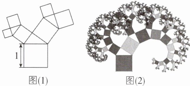 2 [2025山东枣庄期中,中]有一个边长为1的正方形,经过1次“生长”后,在它的左右“肩”上生出两个小正方形,此时这三个正方形的边围成的三角形是直角三角形,再经过1次这样的“生长”后,变成了如图(1)所示的图形。如果照此规律继续“生长”下去,它将变成如图(2)所示的“枝繁叶茂的勾股树”,请你算出“生长”了2025次后形成的图形中所有正方形的面积和是( )