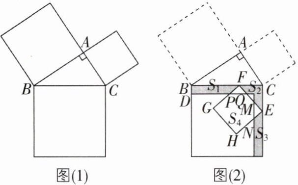 2 勾股定理相传由西周初数学家商高发现,故又称“商高定理”.如图(1),以直角三角形ABC的各边为边分别向外作正方形,再把较小的两个正方形按图(2)的方式放置在最大的正方形内,三块阴影区域面积分别记为S₁,S₂,S₃,两个较小正方形的重叠部分(六边形PQMNHG)的面积记为S₄,则S₁,S₂,S₃,S₄的关系为( )