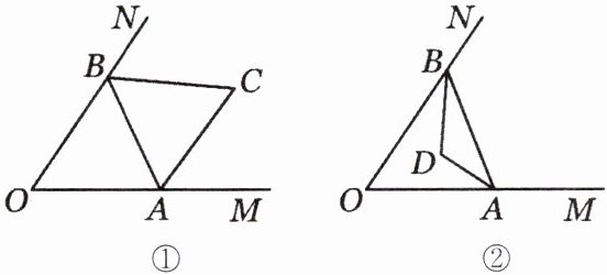 ;(2)如图②,当 $\angle MON = n^{\circ}$ 时,$\angle OAB$,$\angle OBA$ 的平分线交于点 $D$,则 $\angle ADB$ 的度数为