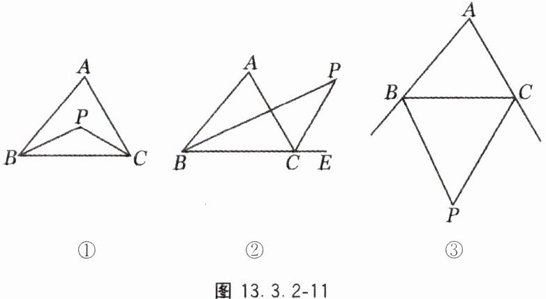 12. 如图 13.3.2 - 11,在图①中,点 P 为△ABC 的内角平分线的交点;在图②中,点 P 为△ABC 的内角平分线与外角平分线的交点;在图③中,点 P 为△ABC 外角平分线的交点. 我们已经探究得出在图①中∠P = 90° + $\frac{1}{2}$∠A,请分别探究在图②、图③中∠A 与∠P 的关系,并选择其中一个图加以说明.