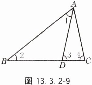 10. 如图 13.3.2 - 9,点 D 是△ABC 的 BC 边上一点,且∠1 = ∠2,∠3 = ∠4,∠BAC = 63°,则∠DAC 的度数为
