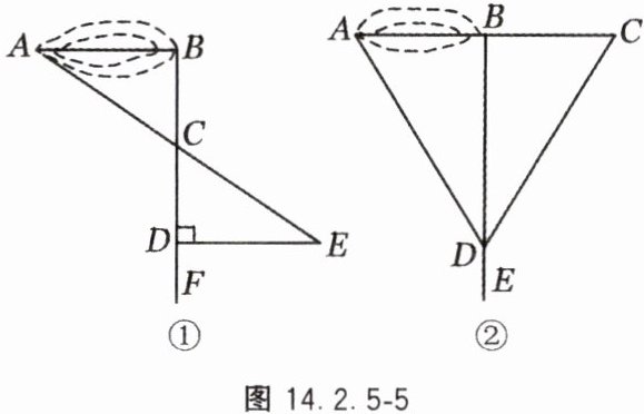 甲:如图 14.2.5 - 5①,先过点 $B$ 作 $AB$ 的垂线 $BF$,再在射线 $BF$ 上取 $C$,$D$ 两点,使 $BC = CD$,接着过点 $D$ 作 $BD$ 的垂线 $DE$,交 $AC$ 的延长线于点 $E$,则测出 $DE$ 的长即为 $A$,$B$ 间的距离;