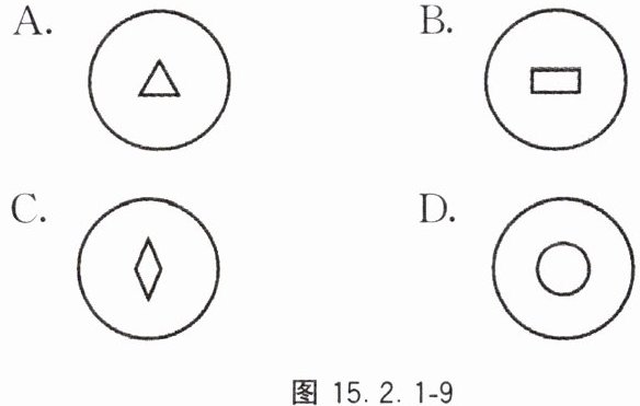 9. 将圆形纸片对折后再对折,得到如图 15.2.1 - 8 所示的图形,然后沿着图中的虚线剪开,得到两部分,其中一部分展开后的平面图形是图 15.2.1 - 9 中的(