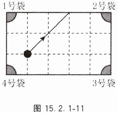 11. 图 15.2.1 - 11 是一个改造过的台球桌面的示意图,图中四个角上的阴影部分分别表示四个入球孔。如果一个球按图示方向被击中(球可以经过多次反射),那么该球最后将落入的球袋是(
