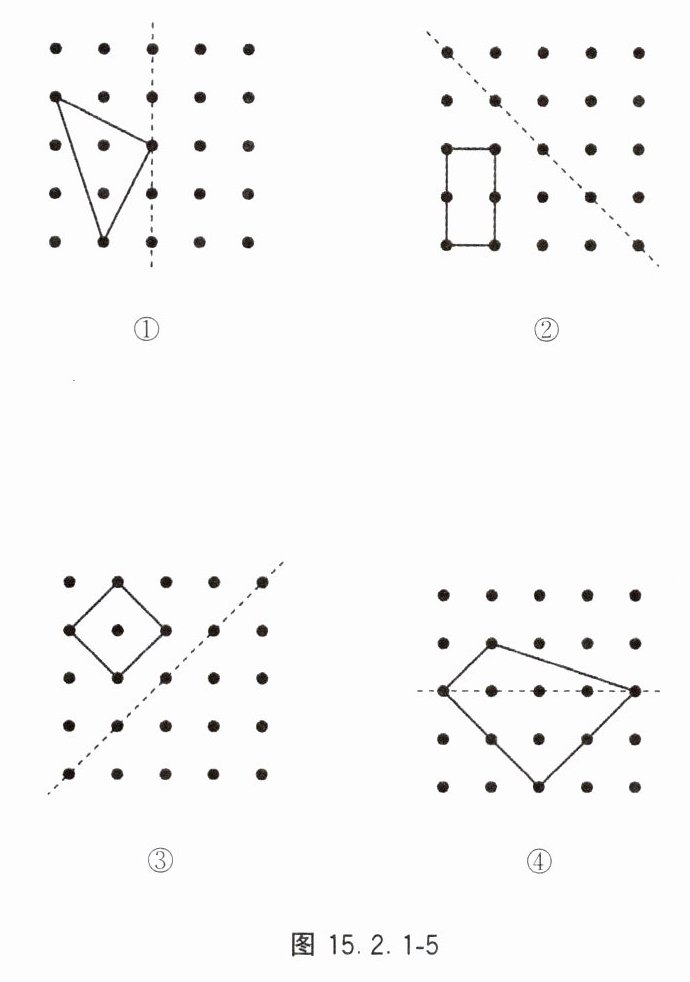 7. 如图 15.2.1 - 5,以虚线为对称轴画出下列各图中已知图形的轴对称图形。
