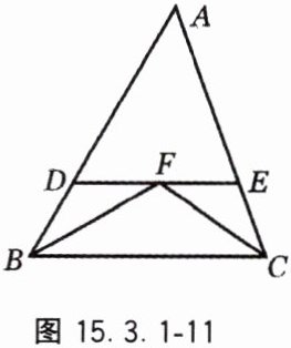 8. 如图 15.3.1 - 11,在△ABC 中,∠ABC,∠ACB 的平分线交于点 F,过点 F 作 DE // BC,交 AB 于点 D,交 AC 于点 E,给出下列结论:①△BDF 和△CEF 都是等腰三角形;②DE = BD + CE;③△ADE 的周长等于 AB + AC;④BF = CF. 其中结论正确的有(