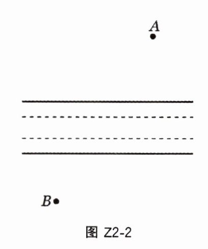 2. 如图 Z2 - 2,从 A 地到 B 地经过一条小河(河岸平行),欲在河上建一座与两岸垂直的桥,应如何选择桥的位置才能使从 A 地到 B 地的路程最短?
