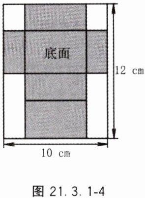 5. 如图 21.3.1 - 4 所示的是一张长 $ 12 cm $、宽 $ 10 cm $ 的矩形铁皮,将其剪去两个全等的正方形和两个全等的矩形,剩余部分(阴影部分)可制成底面积为 $ 24 cm^2 $ 的有盖的长方体铁盒,则剪去的正方形边长是