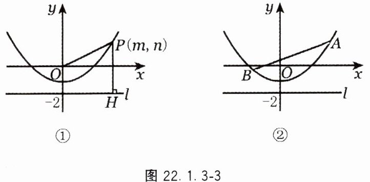17. 如图 22.1.3 - 3①,点 $ P(m, n) $ 是抛物线 $ y = \frac{x^2}{4} - 1 $ 上任意一点,$ l $ 是经过点 $ (0, -2) $ 且与 $ x $ 轴平行的直线,过点 $ P $ 作直线 $ PH \perp l $,垂足为 $ H $。