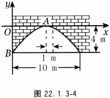 14. 有一个抛物线形的拱形桥洞,桥洞离水面的最大高度为 4 m,跨度为 10 m,建立如图 22.1.3 - 4 所示的平面直角坐标系,使抛物线的顶点 $ A $ 落在 $ x $ 轴上,桥洞底部左边端点 $ B $ 落在 $ y $ 轴上.
