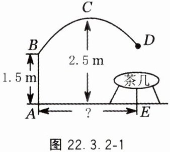 1. 如图 22.3.2 - 1 所示的是一款抛物线型落地灯示意图,防滑螺母 $ C $ 为抛物线支架的最高点,灯罩 $ D $ 距离地面 $ 1.5 \, m $,最高点 $ C $ 距灯柱的水平距离为 $ 1.6 \, m $,灯柱 $ AB = 1.5 \, m $. 若茶几摆放在灯罩的正下方,则茶几到灯柱的距离 $ AE $ 为(