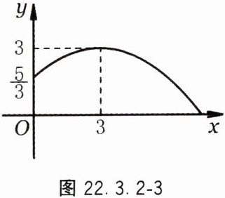 3. 掷实心球是某市高中阶段学校招生体育考试的选考项目,一女生投掷过程中,实心球行进路线是一条抛物线,行进高度 $ y $($ m $)与水平距离 $ x $($ m $)之间的函数关系如图 22.3.2 - 3 所示,抛出时起点处高度为 $ \dfrac{5}{3} \, m $,当水平距离为 $ 3 \, m $ 时,实心球行进至最高点 $ 3 \, m $ 处.