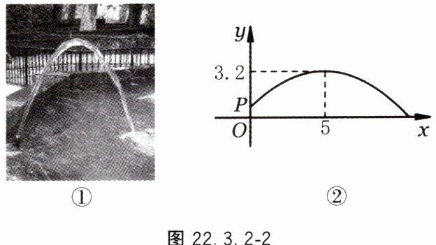 2. 小明看到一处喷水景观,喷出的水柱呈抛物线形状,他对此展开研究:测得喷水头 $ P $ 距地面 $ 0.7 \, m $,水柱在距喷水头 $ P $ 水平距离 $ 5 \, m $ 处达到最高,最高点距地面 $ 3.2 \, m $;建立如图 22.3.2 - 2 所示的平面直角坐标系,并设抛物线的表达式为 $ y = a(x - h)^2 + k $,其中 $ x $($ m $)是水柱距喷水头的水平距离,$ y $($ m $)是水柱距地面的高度.