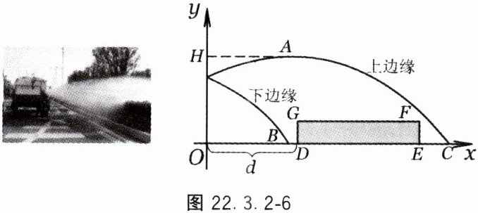 6. 如图 22.3.2 - 6,灌溉车为绿化带浇水,喷水口 $ H $ 离地竖直高度 $ OH $ 为 $ 1.2 \, m $,可以把灌溉车喷出水的上、下边缘抽象为平面直角坐标系中两条抛物线的部分图象;把绿化带横截面抽象为矩形 $ DEFG $,其水平宽度 $ DE = 3 \, m $,竖直高度 $ EF = 1 \, m $. 下边缘抛物线是由上边缘抛物线向左平移得到,上边缘抛物线最高点 $ A $ 离喷水口的水平距离为 $ 2 \, m $,高出喷水口 $ 0.4 \, m $,灌溉车到绿化带的距离 $ OD $ 为 $ d $(单位:$ m $).
