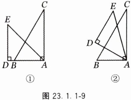 9. 有两个直角三角形纸板,一个含$45°$角,另一个含$30°$角,如图23.1.1-9①所示叠放,先将含$30°$角的纸板固定不动,再将含$45°$角的纸板绕顶点$A$顺时针旋转,使$BC // DE$(如图23.1.1-9②),则旋转角$\angle BAD$的度数为 (