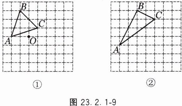 9. 如图 23.2.1 - 9,在正方形网格中,$\triangle ABC$ 的顶点在格点上,请仅用无刻度直尺完成以下作图(保留作图痕迹)。