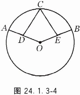 5. 如图 24.1.3 - 4,在$\odot O$中,$\overset{\frown}{AC}=\overset{\frown}{BC}$,点 $D$,$E$ 分别在半径 $OA$ 和 $OB$ 上,$AD = BE$,求证:$CD = CE$.