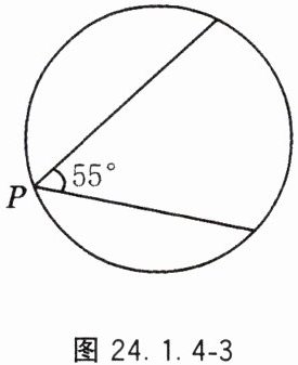 3. 如图24.1.4 - 3,某博览会上有一圆形展示区,在其圆形边缘的点$P$处安装了一台监视器,它的监控角度是$55^{\circ}$,为了监控整个展区,最少需要在圆形边缘上共安装这样的监视器