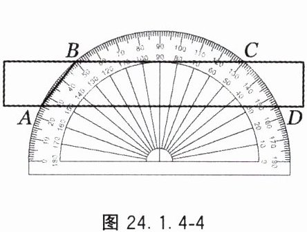 4. 如图24.1.4 - 4,将一个量角器与一把无刻度直尺水平摆放,直尺的长边与量角器的外弧分别交于点$A$,$B$,$C$,$D$,连接$AB$,则$\angle BAD$的度数为