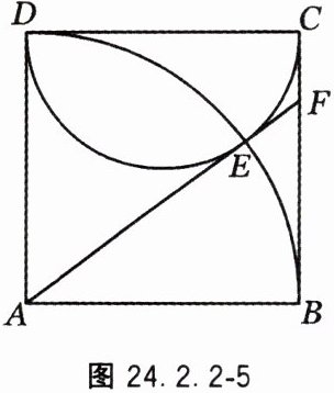 12. 如图 $24.2.2 - 5$,四边形 $ABCD$ 是正方形,以点 $A$ 为圆心,$AB$ 为半径画弧,交以 $CD$ 为直径的半圆于点 $E$,连接 $AE$ 并延长,交 $BC$ 于点 $F$。判断 $AE$ 与半圆的位置关系,并说明理由。