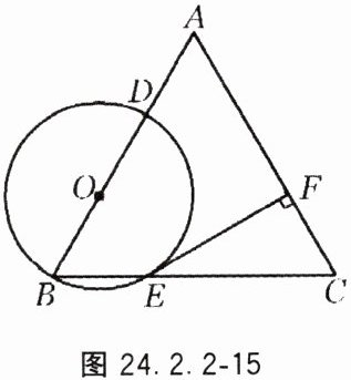 9. 如图 24.2.2 - 15,已知 $\triangle ABC$ 是边长为 $4$ 的等边三角形,点 $O$ 在边 $AB$ 上,$⊙O$ 过点 $B$ 且分别与边 $AB$,$BC$ 相交于点 $D$,$E$,$EF⊥AC$,垂足为 $F$。