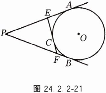 3. 如图 24.2.2 - 21,$ PA $,$ PB $ 分别与 $ \odot O $ 相切于点 $ A $,$ B $,$ \odot O $ 的切线 $ EF $ 分别交 $ PA $,$ PB $ 于点 $ E $,$ F $,切点 $ C $ 在 $ \overset{\frown}{AB} $ 上. 若 $ PA $ 长为 $ 2 $,则 $ \triangle PEF $ 的周长是 \_\_\_\_.