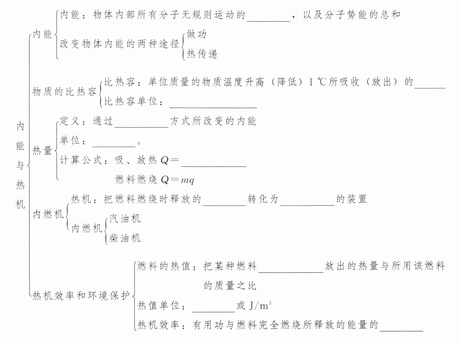 【答案】:动能;热量;$J/(kg\cdot^{\circ}C)$;热传递;$J$;$cm\Delta t$;内能;机械能;完全燃烧;$J/kg$;比值。