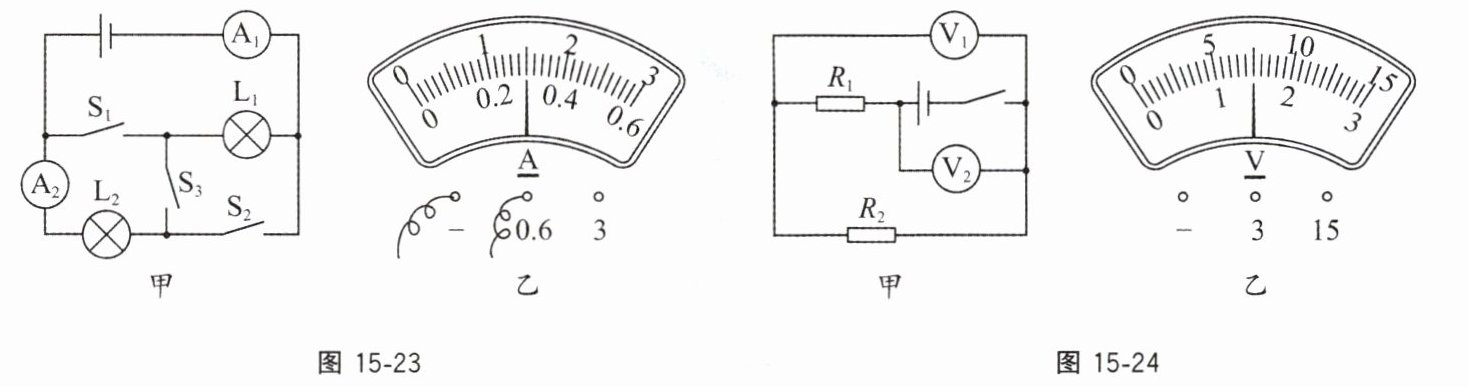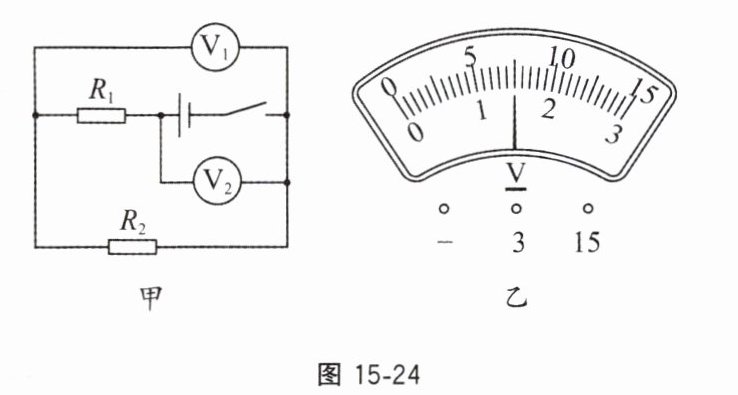 6. 如图15-24甲所示,当闭合开关、用电器正常工作时,电压表$V_{1}和V_{2}$的指针位置完全一样,如图乙所示,则$R_{1}$两端的电压为