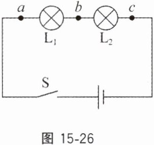 例2 小明用如图 15 - 26 所示电路来探究串联电路中的电压关系。已知电源电压为 $ 6V $,当开关 $ S $ 闭合后,发现两灯均不亮。他用电压表分别测 $ a $、$ c $ 和 $ a $、$ b $ 两点间的电压,发现两次电压表示数均为 $ 6V $,由此判定灯
