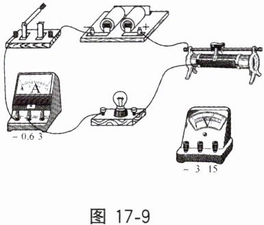 例 3 如图 17 - 9 所示,某实验小组使用下列器材测定小灯泡的功率:待测小灯泡(额定电流$0.5A$,额定功率不大于$1.5W$)、电压表($0~3V$、$0~15V$双量程)、电流表($0~0.6A$、$0~3A$双量程)、滑动变阻器、电源、开关、导线等。