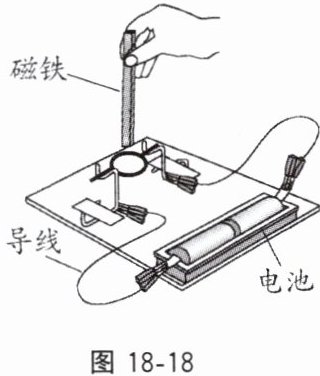 8. 在安装直流电动机模型的实验中,小杰同学按照教材的要求安装了一台如图18 - 18所示的直流电动机模型。安装完毕,拿一块条形磁铁,把磁铁N极放在线圈上方,接通电源,线圈顺时针方向转动;把磁铁S极放在线圈的上方,接通电源,线圈逆时针方向转动。
