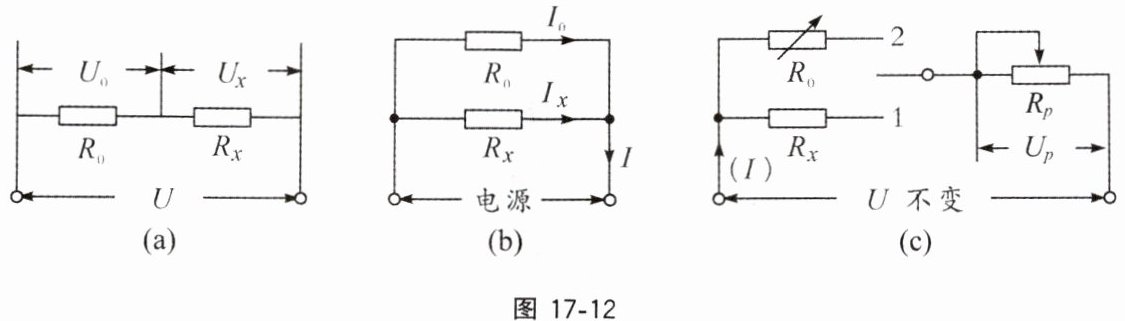 ①串联分压法:如图17 - 12(a)所示,将待测电阻$R_{x}$与已知电阻$R_{0}$串联,测量总电压和分电压,利用分压公式$\frac{U_{x}}{U_{0}}=\frac{R_{x}}{R_{0}}$计算$R_{x}$。需要电压表测量分电压。