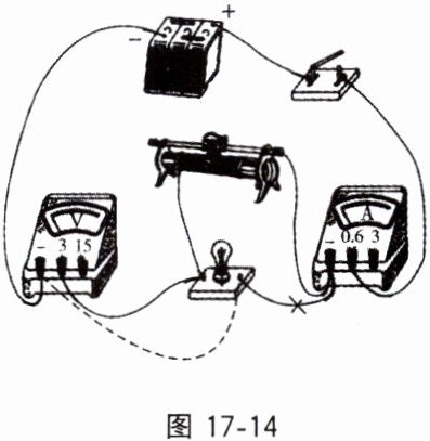 灯丝电阻不相等的原因主要是,当小灯泡两端的电压升高时,灯丝的温度发生了变化。答案:(1)小灯泡不亮,电压表有示数,电流表无示数;(2)如图17 - 14所示(虚线为改接导线);(3)11.2;随着小灯泡两端电压的升高,通过的电流增大,使灯丝的温度升高,电阻变大。
