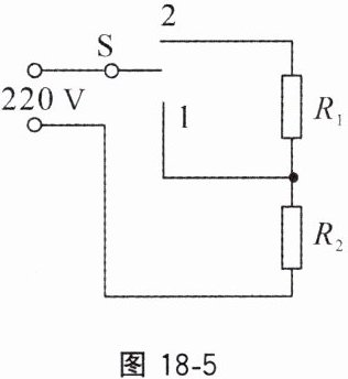 例 2 某家用电热毯有“高”和“低”两个挡位,其简化电路如图 18 - 5 所示,$R_{1}$、$R_{2}$是电热丝,$R_{1}=880\Omega$,$R_{2}=220\Omega$。开关 S 接“1”时,电热毯为挡位,开关 S 接“2”时,通电 1 min 电热毯产生的热量为J。