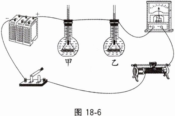 1. 小明利用如图 18 - 6 所示的装置探究电流产生的热量多少与哪些因素有关。他在两个相同的烧瓶中装满煤油,瓶中各放置一根电阻丝,且$R_{甲}>R_{乙}$,通电一段时间后,甲瓶玻璃管中的煤油上升得比乙高。这现象能说明电流产生的热量多少与下列哪个因素有关?(