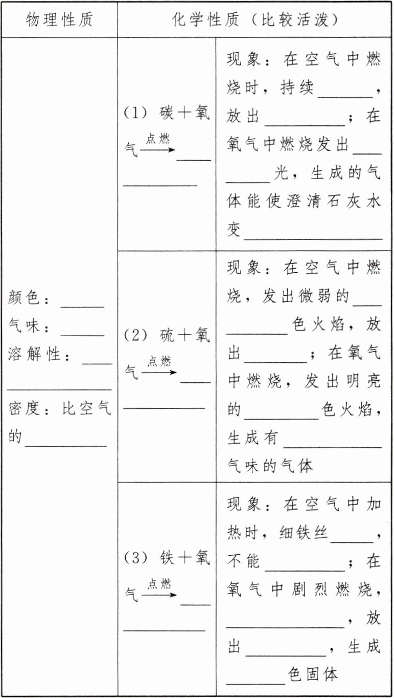 无色 无臭 不易溶于水 略大 (1)二氧化碳 红热 热量 白 浑浊 (2)二氧化硫 淡蓝 热量 蓝紫 刺激性 (3)四氧化三铁 红热 燃烧 火星四射 热量 黑