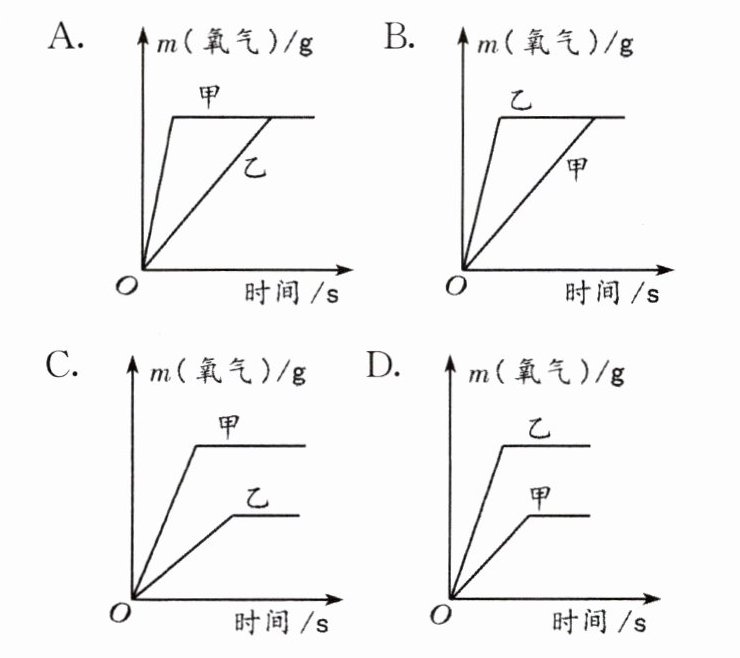 3. 甲、乙两支试管各盛有等量的同种过氧化氢溶液,向试管中分别加入等量的二氧化锰和氧化铜粉末。下列图像最能体现两支试管中生成氧气的质量随时间的变化关系的是(