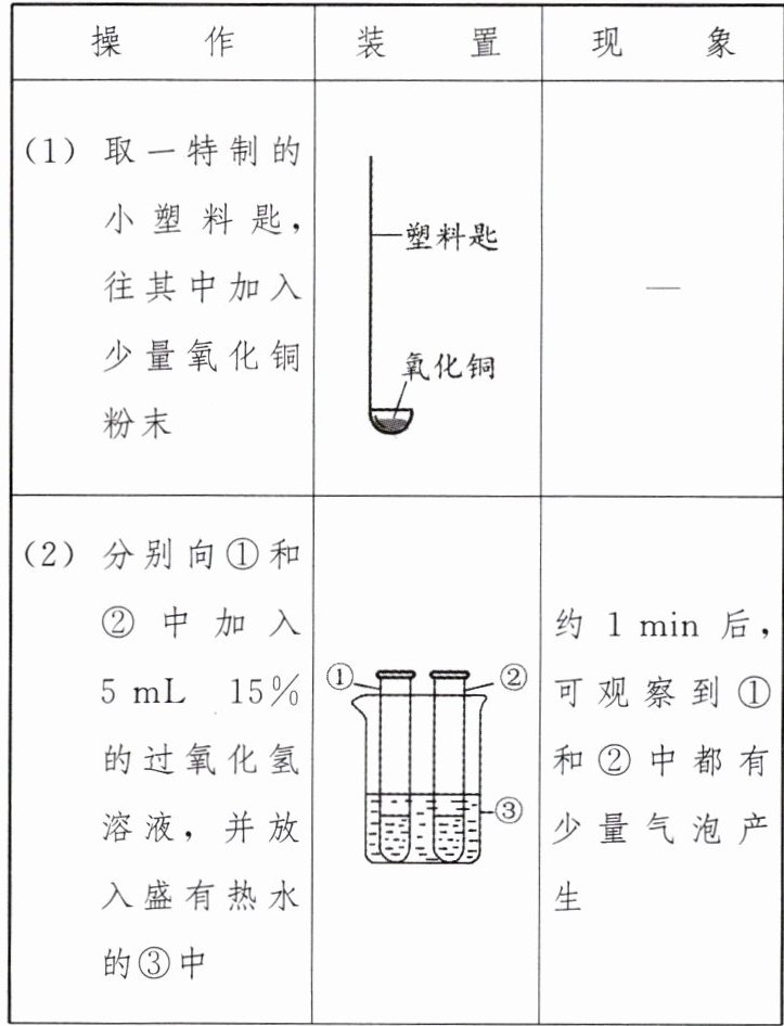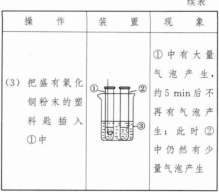|(3)把盛有氧化铜粉末的塑料匙插入①中||①中有大量气泡产生,约5 min后不再有气泡产生;此时②中仍然有少量气泡产生|