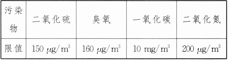 |限值|$150μg/m^3$|$160μg/m^3$|$10mg/m^3$|$200μg/m^3$|