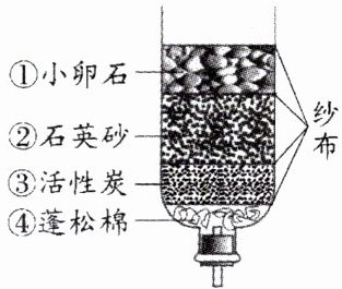 解析 应用不同材料净水时,判断其先后顺序的依据是净水效果由差到好,或先除去易除的物质,再除去难除的物质。活性炭的净水效果比石英砂的好,所以②与③位置不能对调,A 项说法错误,不符合题意。活性炭除了可以吸附一些溶解的杂质、除去异味,还有过滤作用,B 项说法正确,符合题意。该净水器中没有漂白粉等消毒剂,不具有杀菌、消毒功能,C 项说法错误,不符合题意。经过滤、吸附处理后的水中仍然含有一些可溶性杂质,得到的不是纯水,D 项说法错误,不符合题意。故答案为 B。