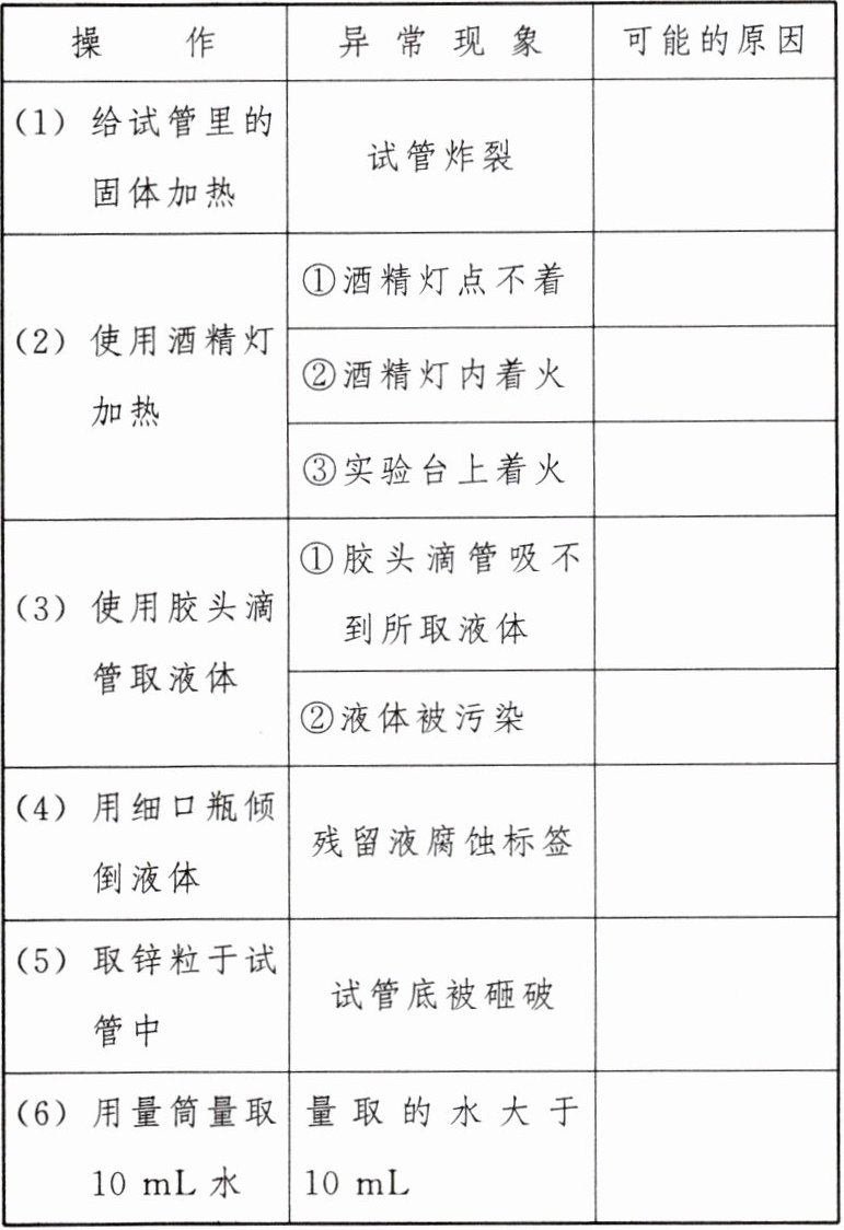 可能的原因分别是:(1)试管外壁有水;未预热试管;加热时试管口未略向下倾斜。(2)①酒精灯长期未盖灯帽,灯芯上的酒精挥发;②用嘴吹灭酒精灯;③不慎碰倒酒精灯。(3)①胶头滴管的橡胶帽老化或因使用不当被腐蚀而破裂;②胶头滴管内有杂质,未及时洗干净。(4)倾倒液体时,细口瓶贴标签的一面未朝向手心。(5)放锌粒时,试管直立。(6)用胶头滴管定容时,仰视量筒刻度线。